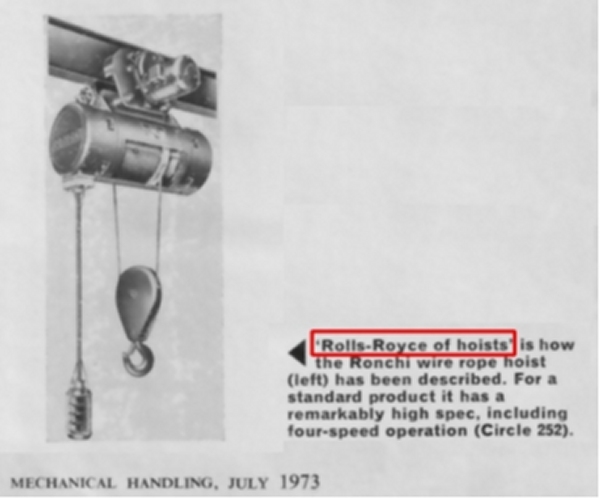 I prodotti di punta della Ronchi sono i paranchi, definiti dalla rivista inglese Mechanical Handling “I Roll Royce dei Paranchi”: "Roll Royce of hoists"