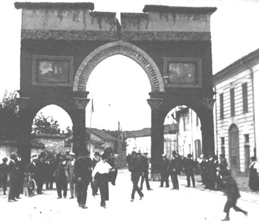 Concorezzo - Agosto 1921 - Si celebra il VI centenario della morte del Beato Rainaldo da Concorezzo [1]- Imponenti furono i festeggiamenti: con un lavoro entusiasmante vie, piazze e angoli del paese si trasformarono in giardini ornati di fontane, grotte e archetti trionfali; furono allestiti quattro archi trionfali in altrettanti punti di accesso al borgo.[2]
